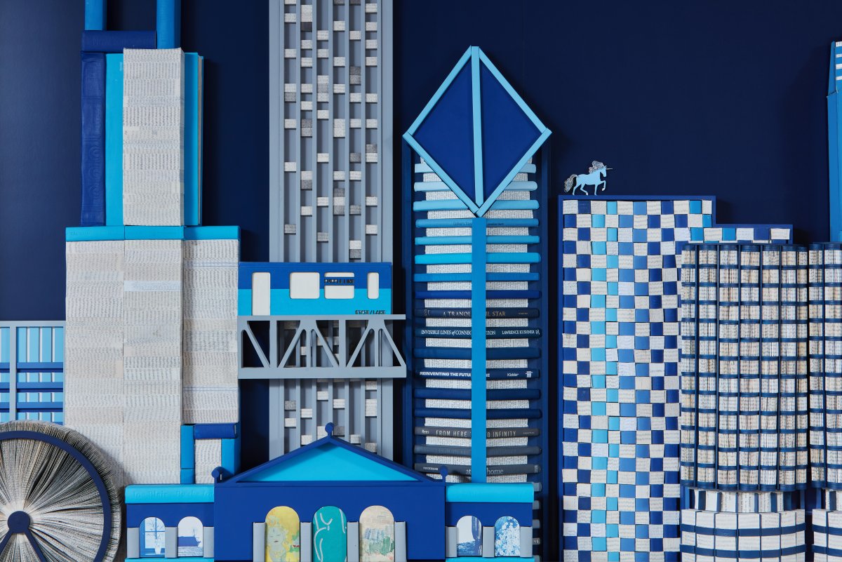 Box wanted a few feature walls for their Chicago office - their logo in bright yellow on brick and a miniature sculpted Chicago cityscape made out of books. Each iconic building was meticulously designed and then painstakingly sculpted, sometimes page-by-page, with plenty of Easter eggs made especially for the Box team.
