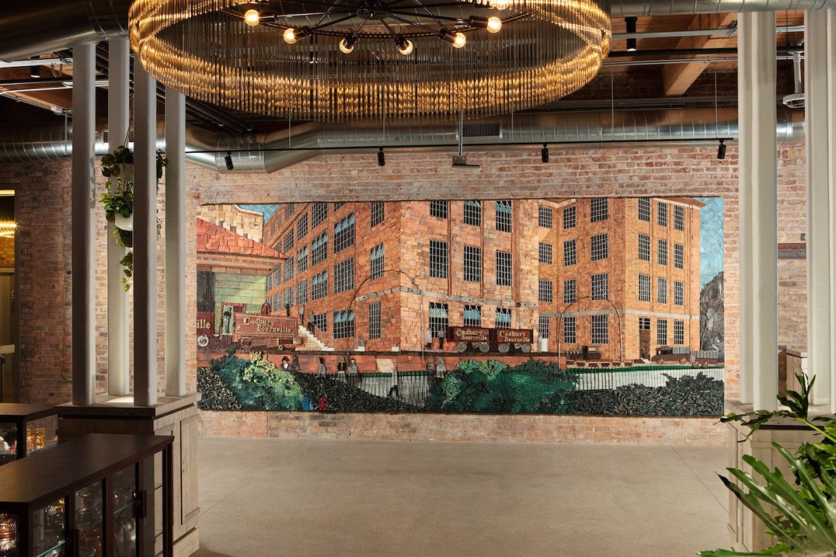 Mondelez International is a company that’s known for classic snacks such as Cadbury and Oreos. In collaboration with Johalla Projects, we designed and created a piece of art that harkened back to the town of Bournville, the birthplace of Cadbury chocolate. The image was made with found building materials from throughout Fulton Market, where the mural lives housed within Mondelez’s new chocolatier.