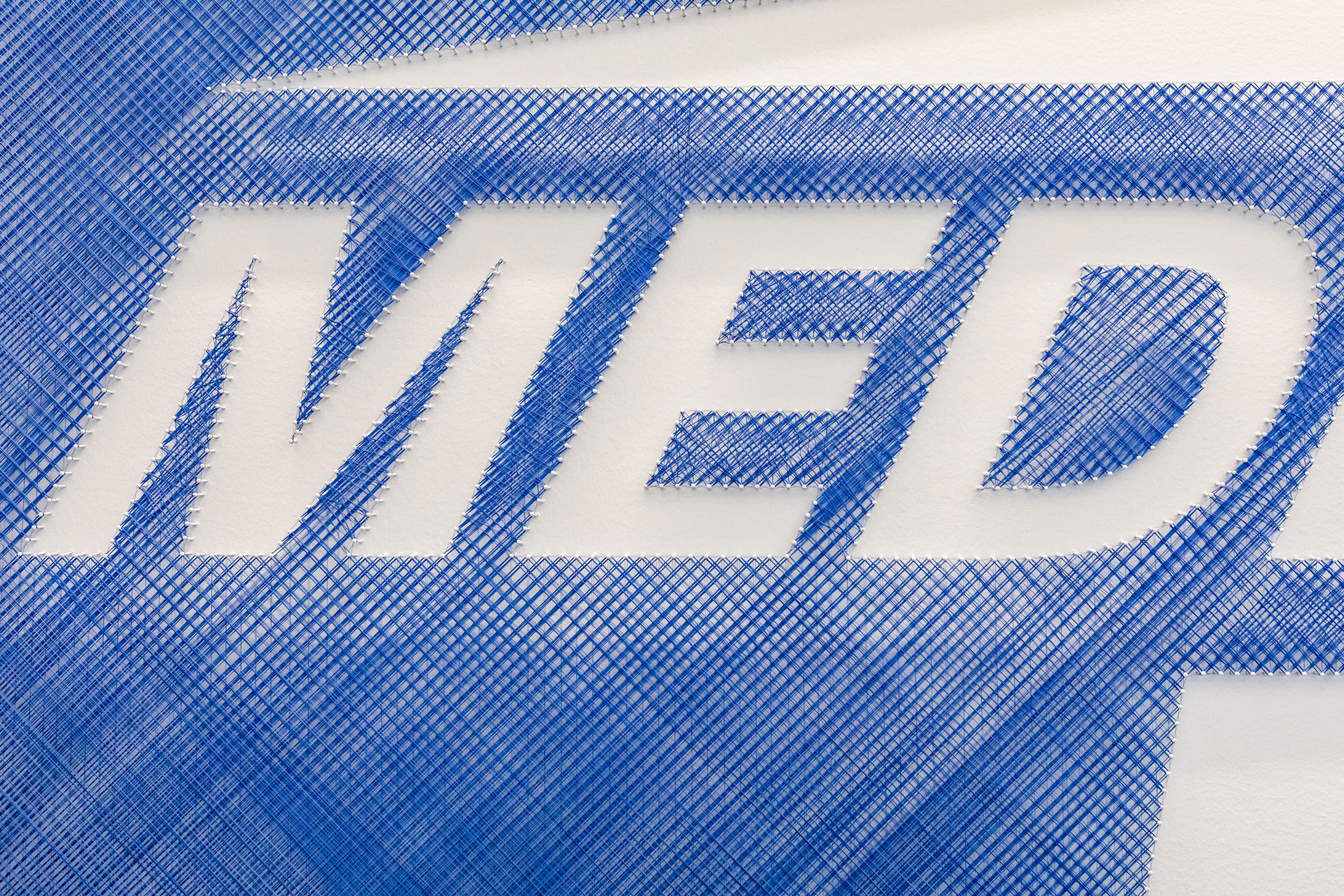 Influenced by the idea of suture thread, we created the Medline logo to grace the wall behind their reception area. This installation used 18,900 yards of string.